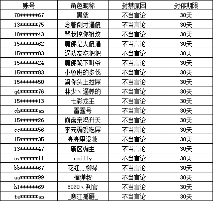 以下为新封号规则发布以来,2025年11月25日-12月25日期间封停30天名单,下列用户在游戏内使用不当言语、字符恶意侮辱、诽谤他人。根据相关规定,此类行为不仅严重破坏社区和谐氛围,也可能构成对他人合法权益的侵害。我们郑重提醒全体玩家,网络空间并非法外之地,希望各位玩家能够引以为戒,规范自身言行,共同营造一个公平、友善的游戏环境。