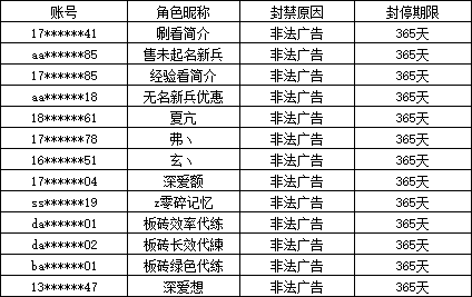 以下为新封号规则发布以来,2025年11月25日-12月25日期间封停365天名单,本次重点打击行为包括:在游戏内发布非法网站、宣传游戏代码、木马、外挂、病毒、垃圾广告等非法信息。此类行为严重破坏游戏体验,运营团队将依据规则予以严厉处罚。请各位玩家增强安全意识,切勿轻信游戏内任何非官方广告,避免账号及财产损失。