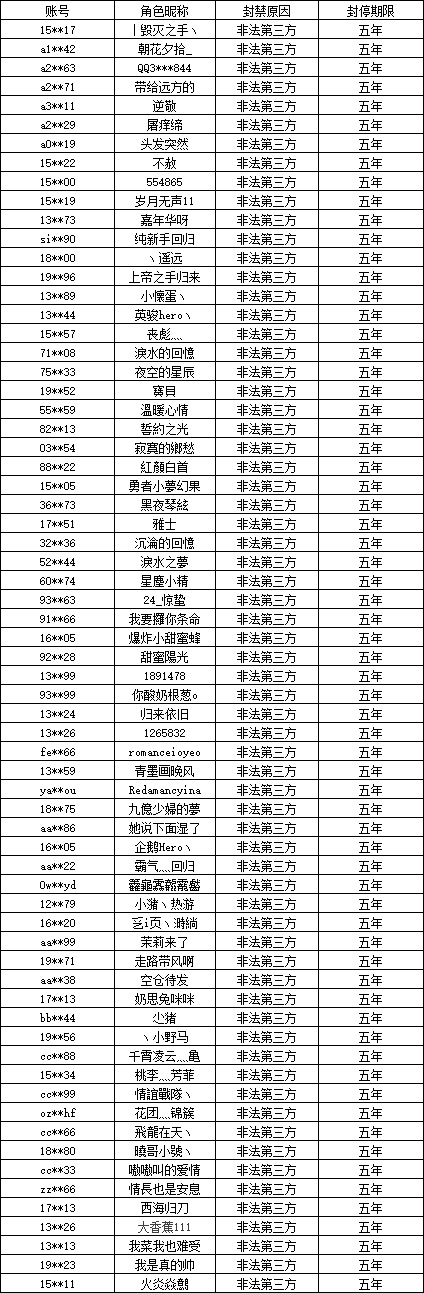 以下为新封号规则发布以来,2026年2月1日-2月28日封停五年名单,用户利用(非法第三方软件,非法驱动,第三方辅助工具等)恶意破坏游戏平衡,根据情节轻重给予五年的封停处罚。