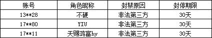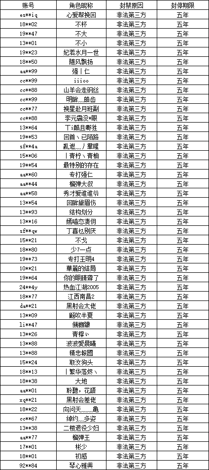 以下为2月28日安全处罚公示发布以来,2026年3月1日-3月6日封停五年名单,用户利用(非法第三方软件,非法驱动,第三方辅助工具等)恶意破坏游戏平衡,根据情节轻重给予五年的封停处罚