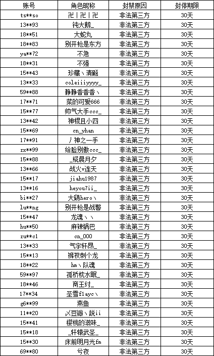 以下为4月11日安全处罚公示发布以来,2026年4月11日-4月17日期间封停30天名单,首次违规的玩家,将处以30天账号封禁的处罚