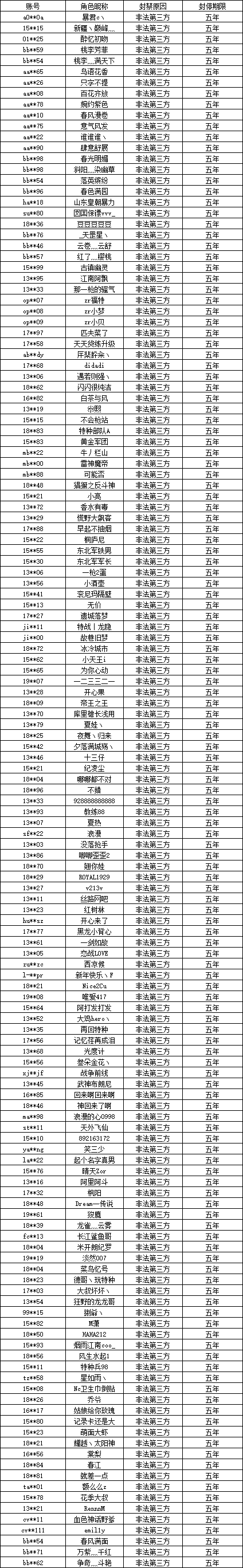以下为4月11日安全处罚公示发布以来,2026年4月11日-4月17日期间封停五年名单,用户利用(非法第三方软件,非法驱动,第三方辅助工具等)恶意破坏游戏平衡,根据情节轻重给予五年的封停处罚